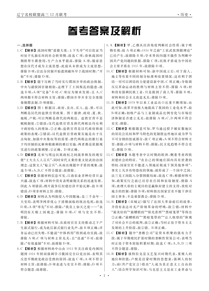 辽宁省名校联盟2023-2024学年高三上学期12月联合考试 历史答案