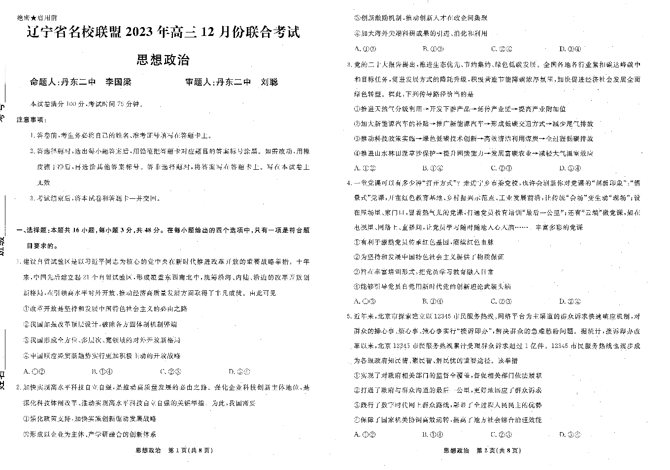 辽宁省名校联盟2023-2024学年高三上学期12月联合考试 政治