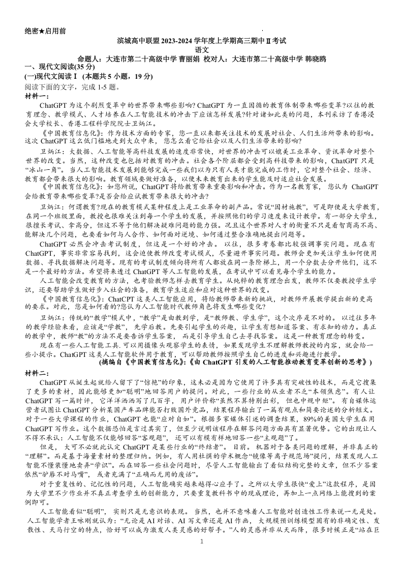辽宁省大连市滨城高中联盟2023-2024学年高三上学期期中(Ⅱ)考试 语文