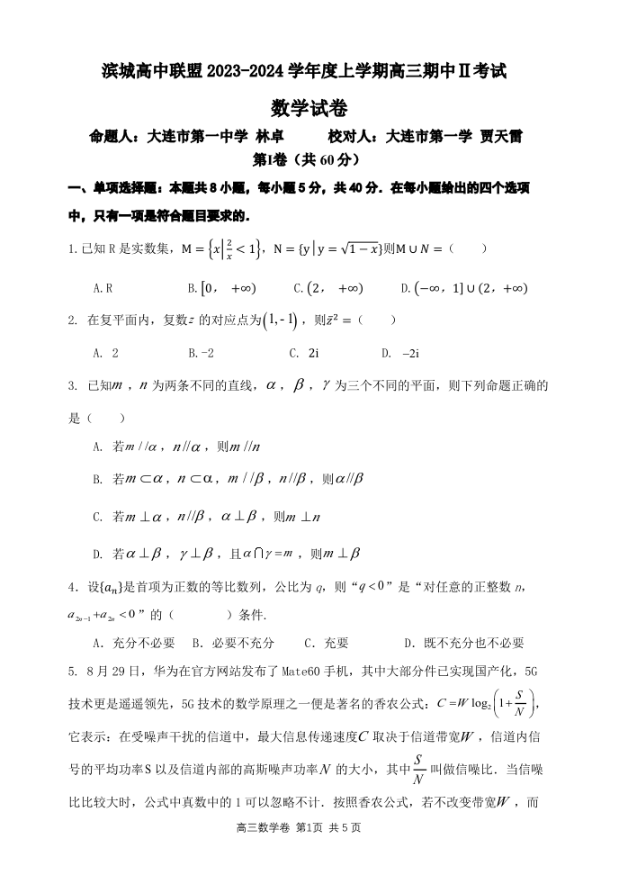 辽宁省大连市滨城高中联盟2023-2024学年高三上学期期中(Ⅱ)考试 数学