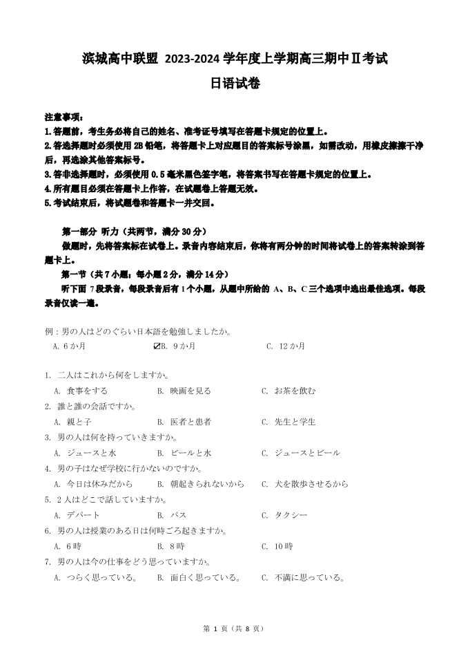 辽宁省大连市滨城高中联盟2023-2024学年高三上学期期中(Ⅱ)考试 日语
