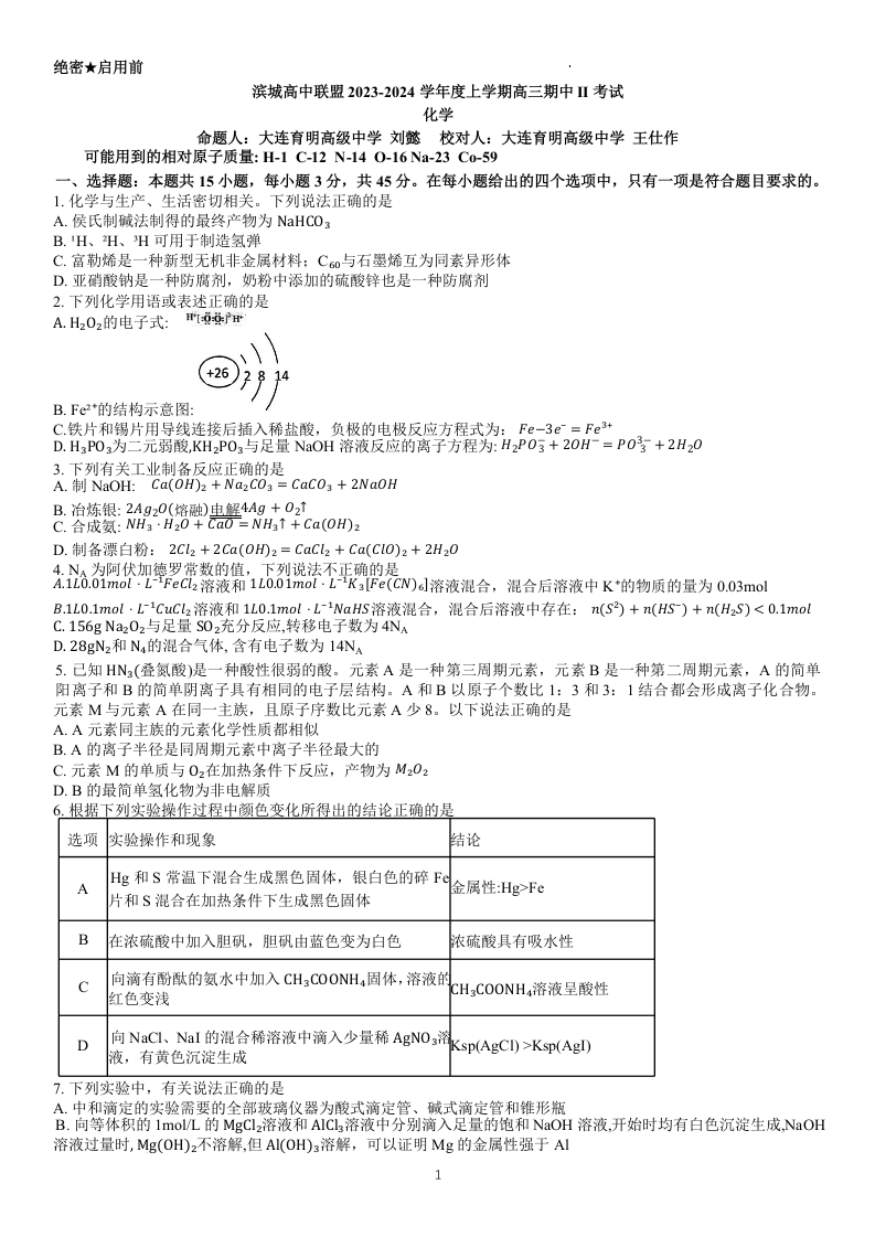 辽宁省大连市滨城高中联盟2023-2024学年高三上学期期中(Ⅱ)考试 化学