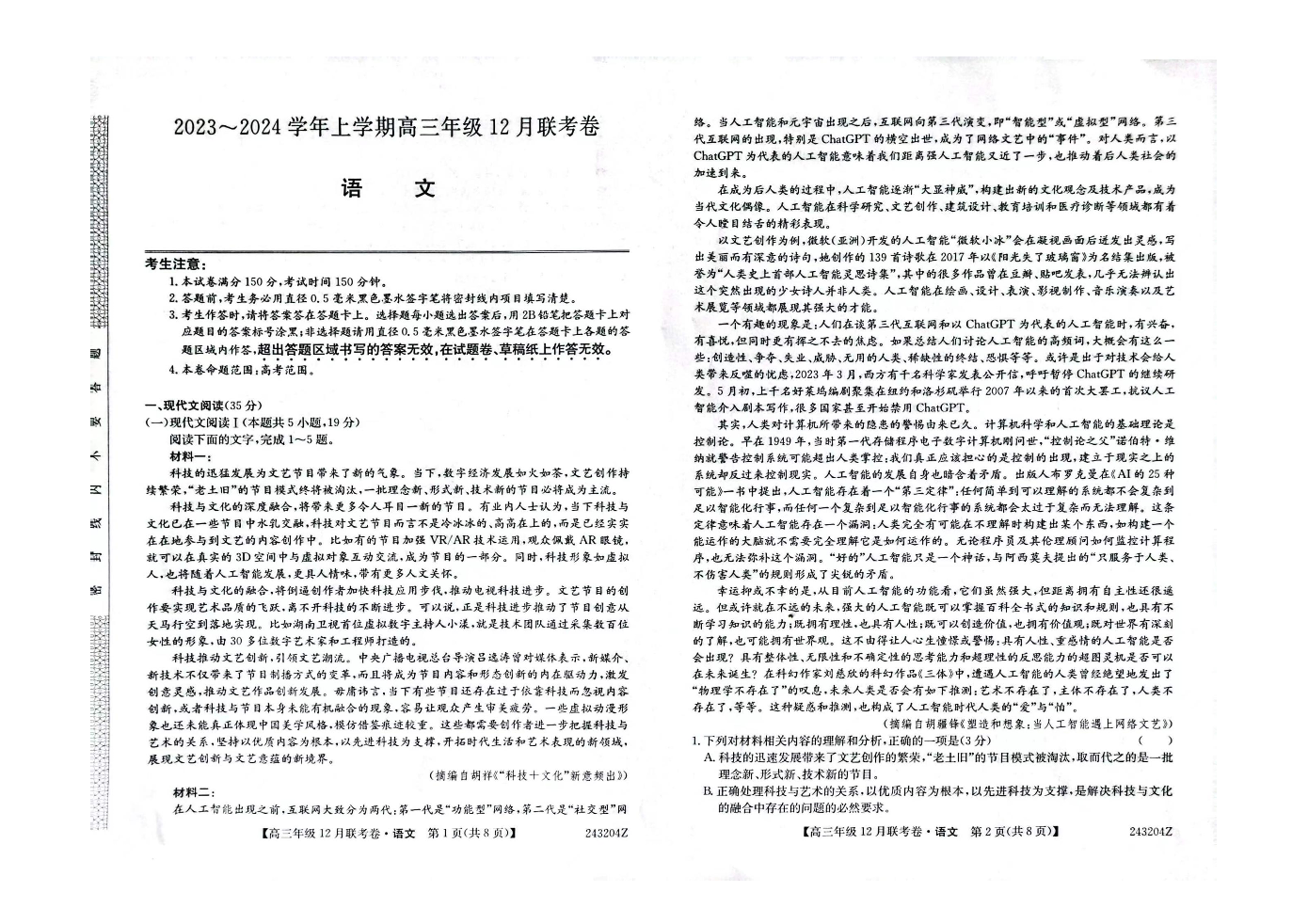 辽宁省部分学校2023-2024学年高三上学期12月联考 语文