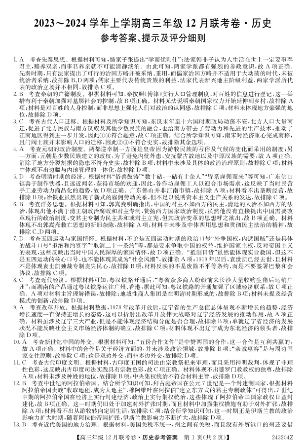 辽宁省部分学校2023-2024学年高三上学期12月联考 历史答案
