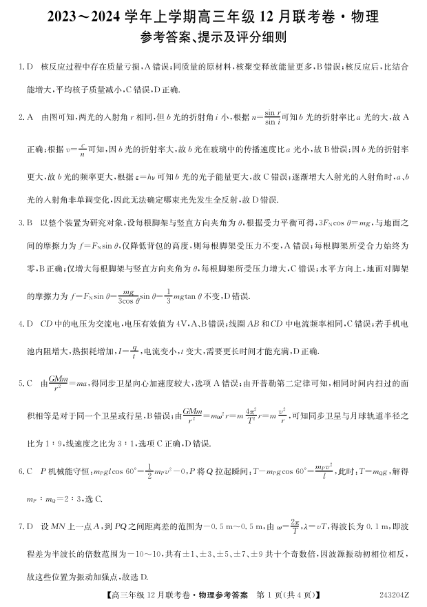辽宁省部分学校2023-2024学年高三上学期12月联考 物理答案