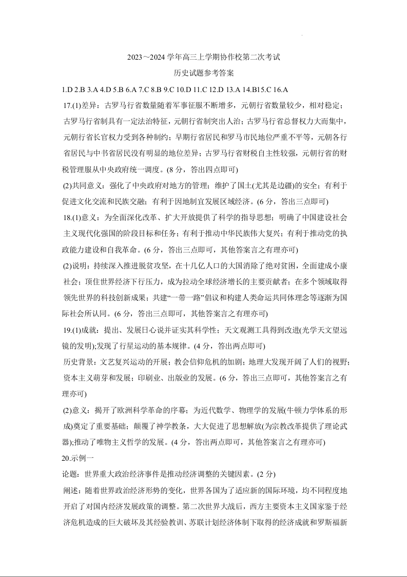 辽宁省葫芦岛市协作校2023-2024学年高三上学期第二次考试 历史答案