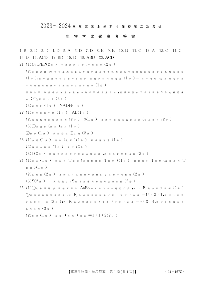 辽宁省葫芦岛市协作校2023-2024学年高三上学期第二次考试 生物答案