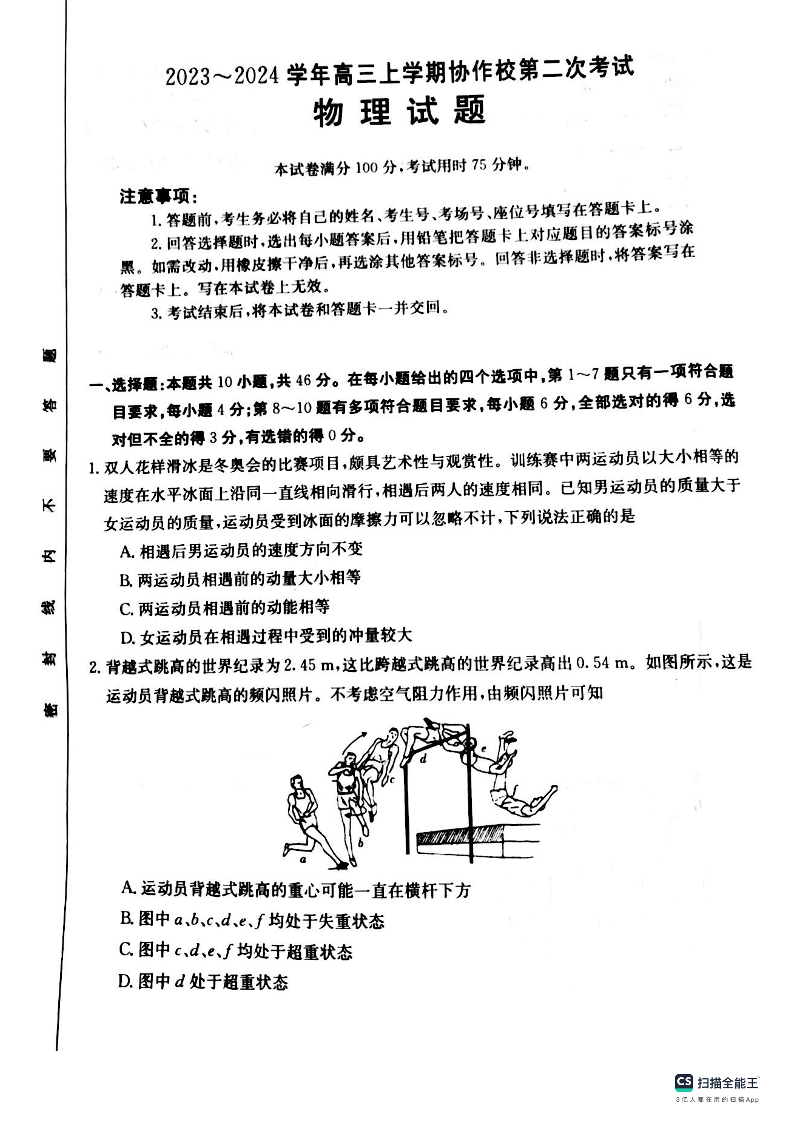 辽宁省葫芦岛市协作校2023-2024学年高三上学期第二次考试 物理