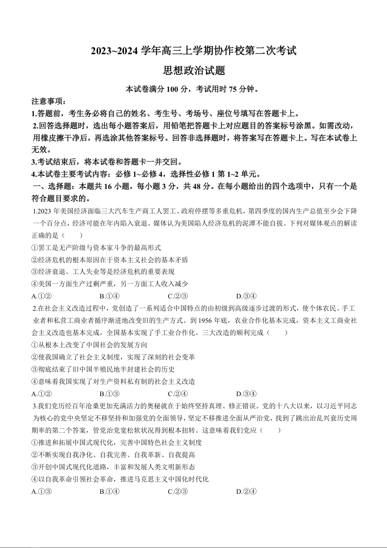 辽宁省葫芦岛市协作校2023-2024学年高三上学期第二次考试 政治