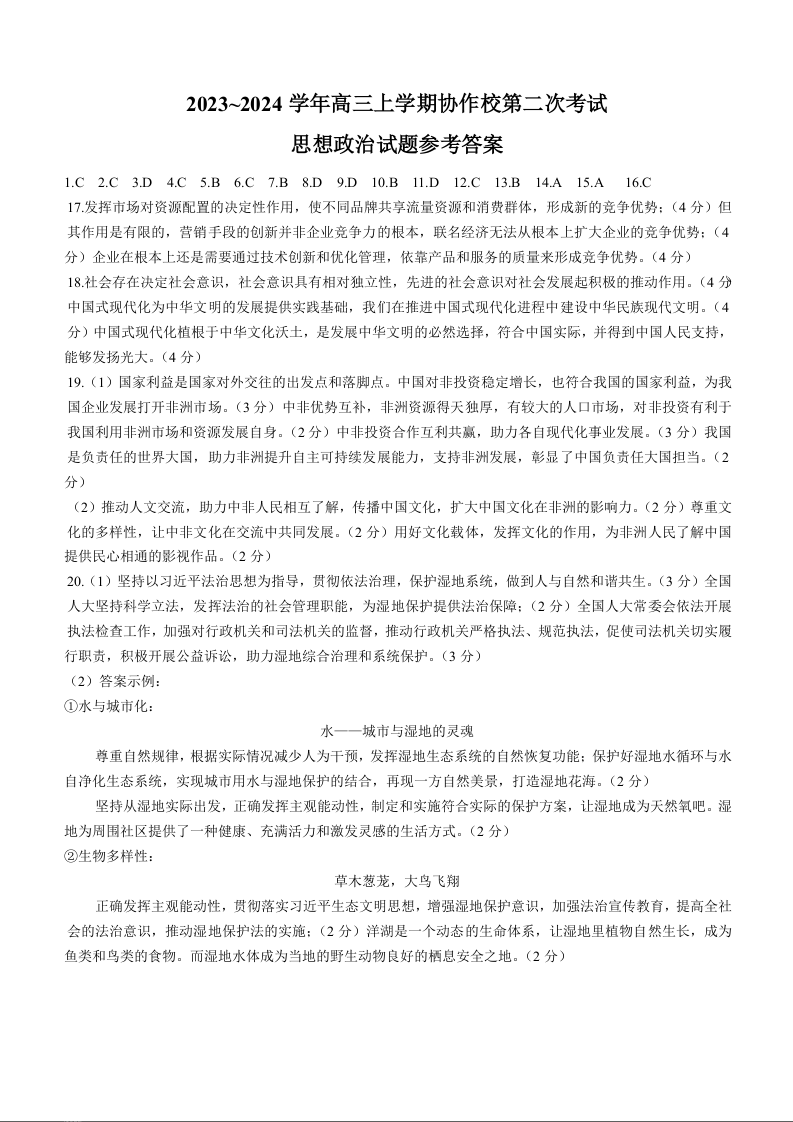 辽宁省葫芦岛市协作校2023-2024学年高三上学期第二次考试 政治答案