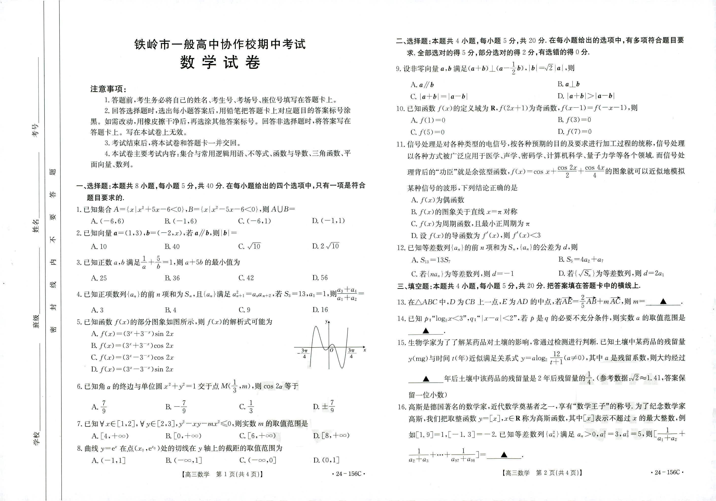 辽宁省铁岭市一般高中协作校2023-2024学年高三上学期期中考试 数学