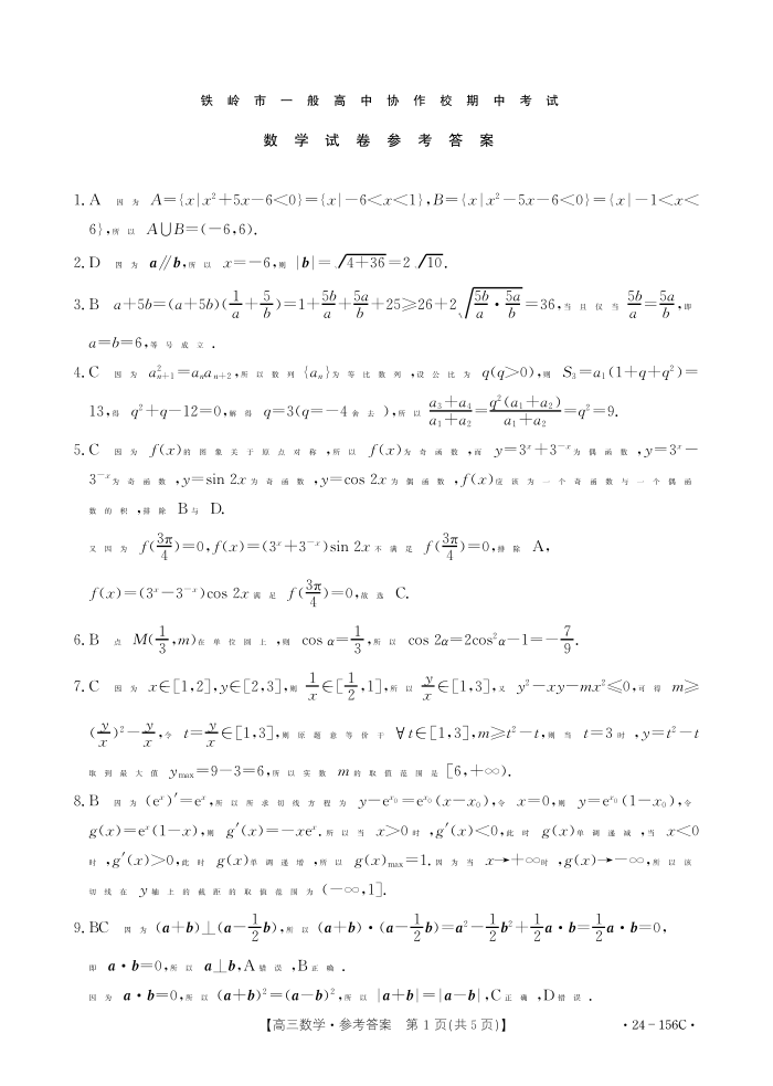 辽宁省铁岭市一般高中协作校2023-2024学年高三上学期期中考试 数学答案