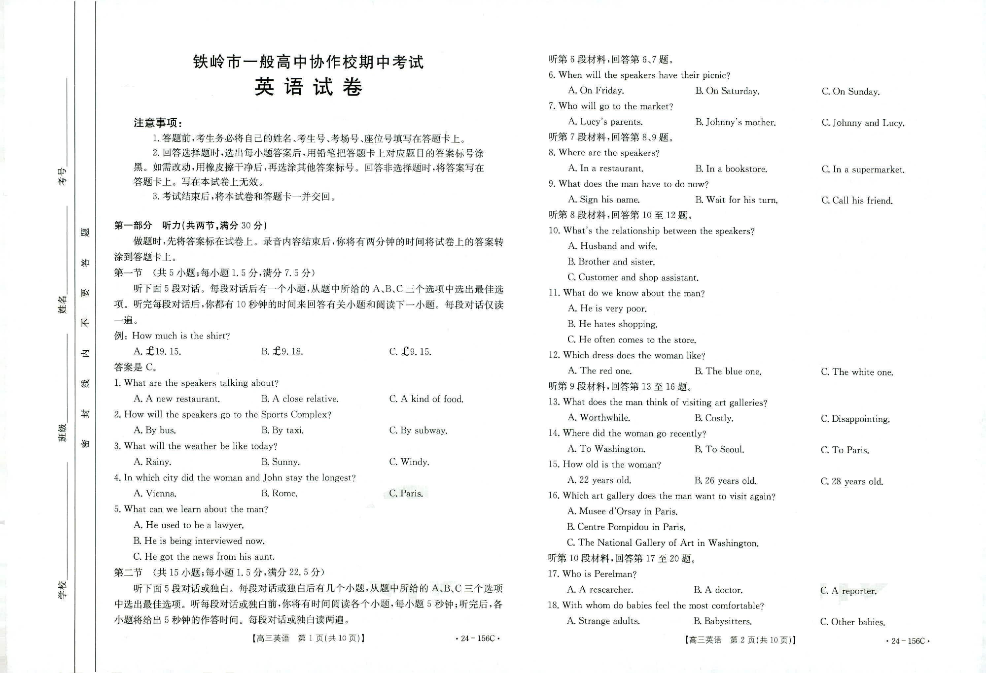 辽宁省铁岭市一般高中协作校2023-2024学年高三上学期期中考试 英语