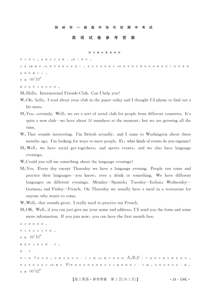 辽宁省铁岭市一般高中协作校2023-2024学年高三上学期期中考试 英语答案
