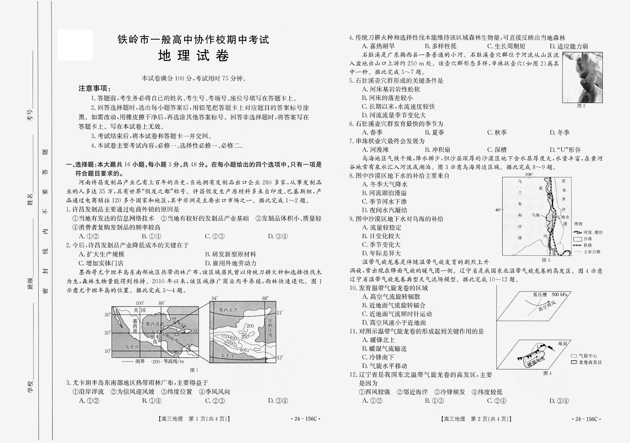 辽宁省铁岭市一般高中协作校2023-2024学年高三上学期期中考试 地理