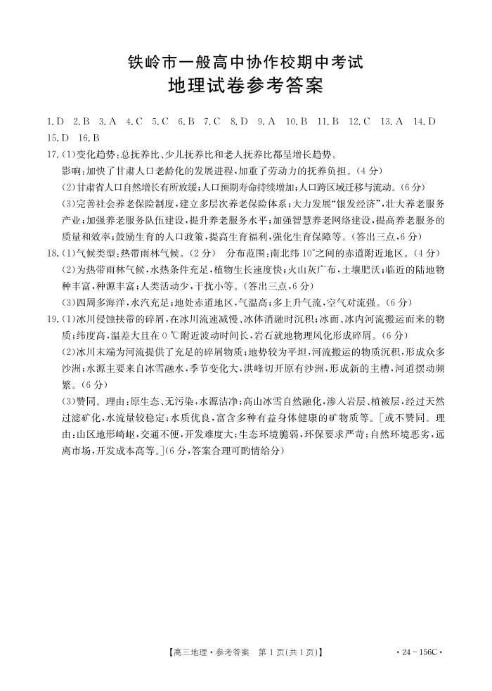 辽宁省铁岭市一般高中协作校2023-2024学年高三上学期期中考试 地理答案