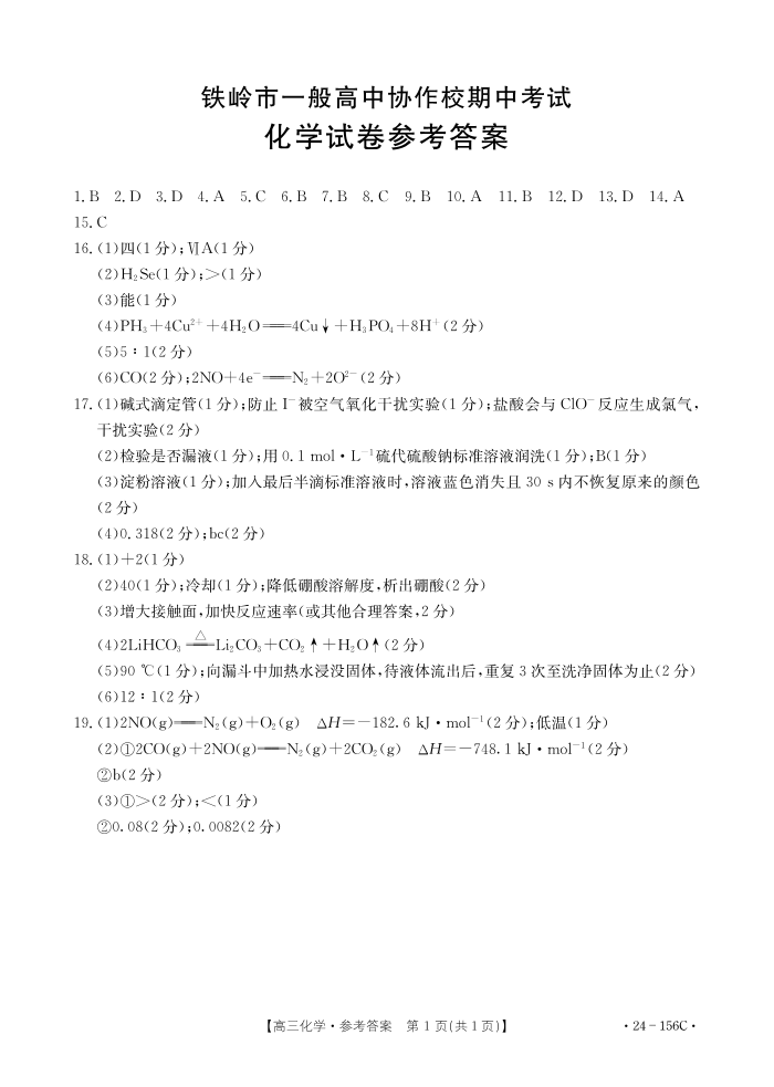 辽宁省铁岭市一般高中协作校2023-2024学年高三上学期期中考试 化学答案