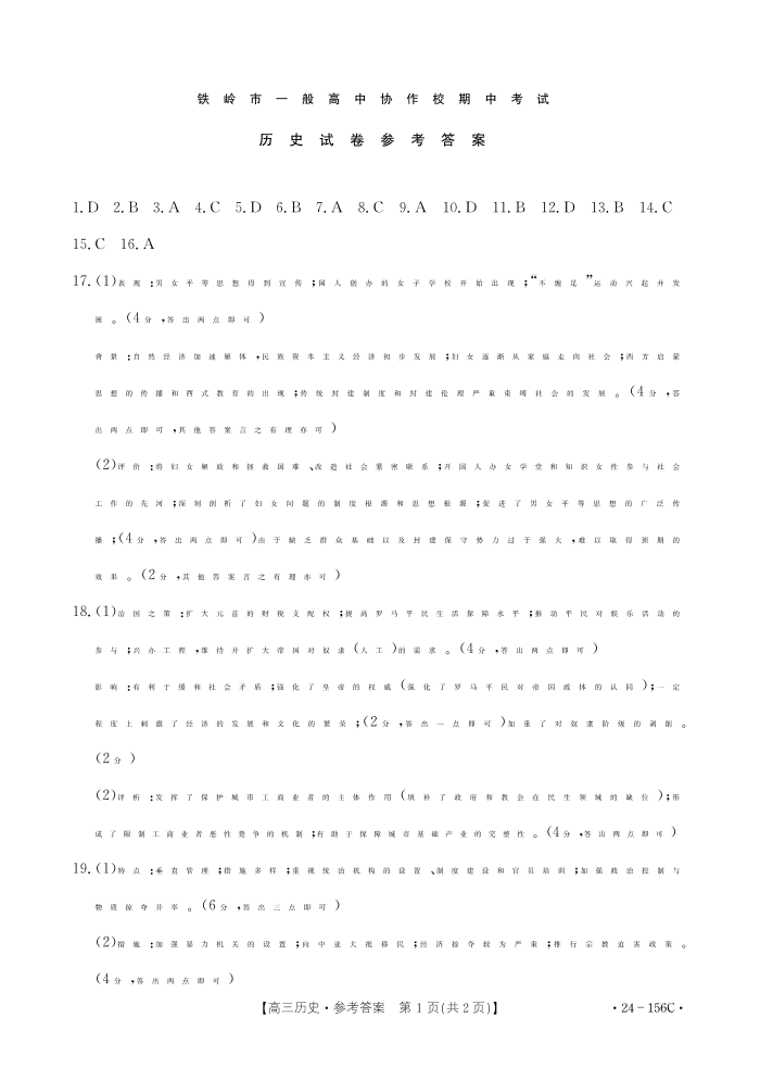 辽宁省铁岭市一般高中协作校2023-2024学年高三上学期期中考试 历史答案