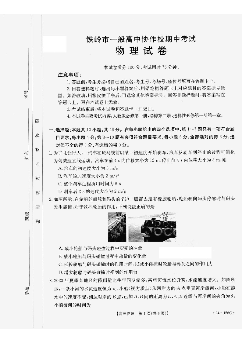 辽宁省铁岭市一般高中协作校2023-2024学年高三上学期期中考试 物理