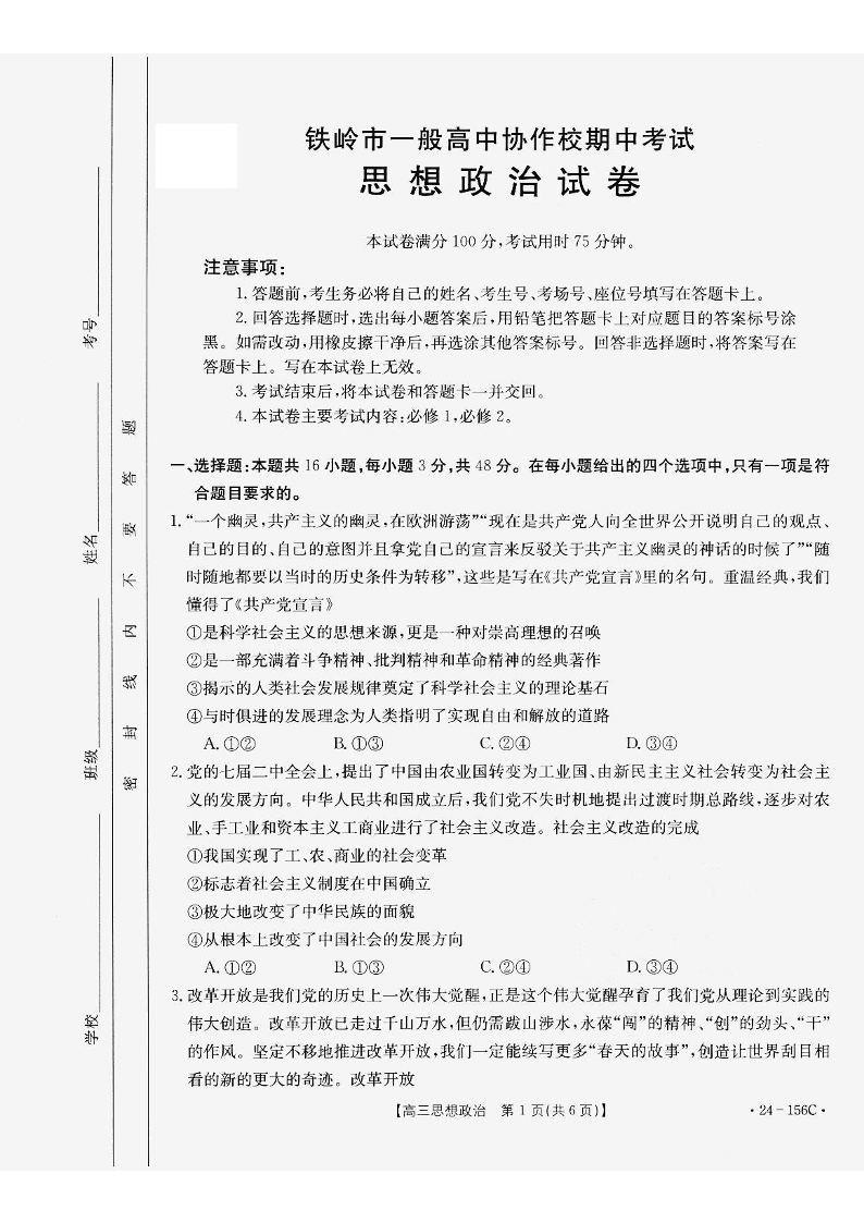 辽宁省铁岭市一般高中协作校2023-2024学年高三上学期期中考试 政治