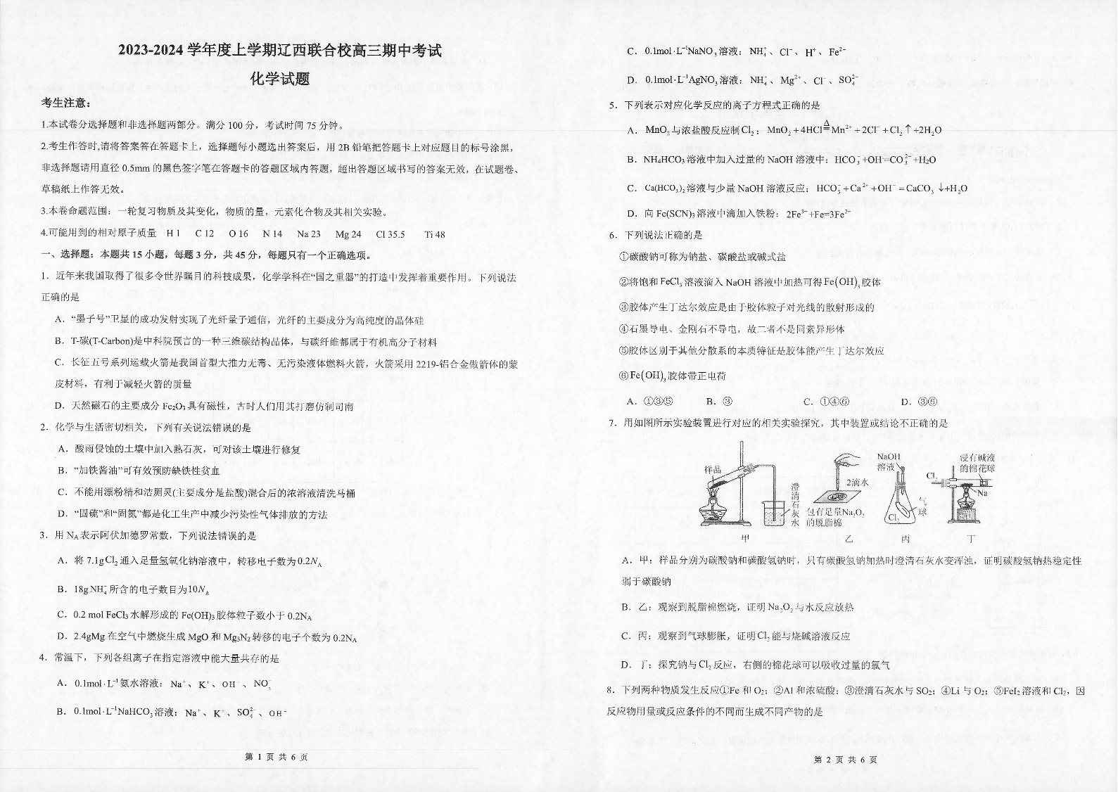 辽宁省辽西联合校2023-2024学年高三上学期期中考试 化学