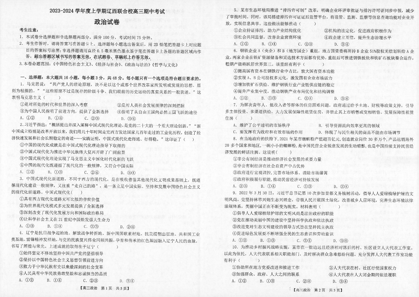 辽宁省辽西联合校2023-2024学年高三上学期期中考试 政治