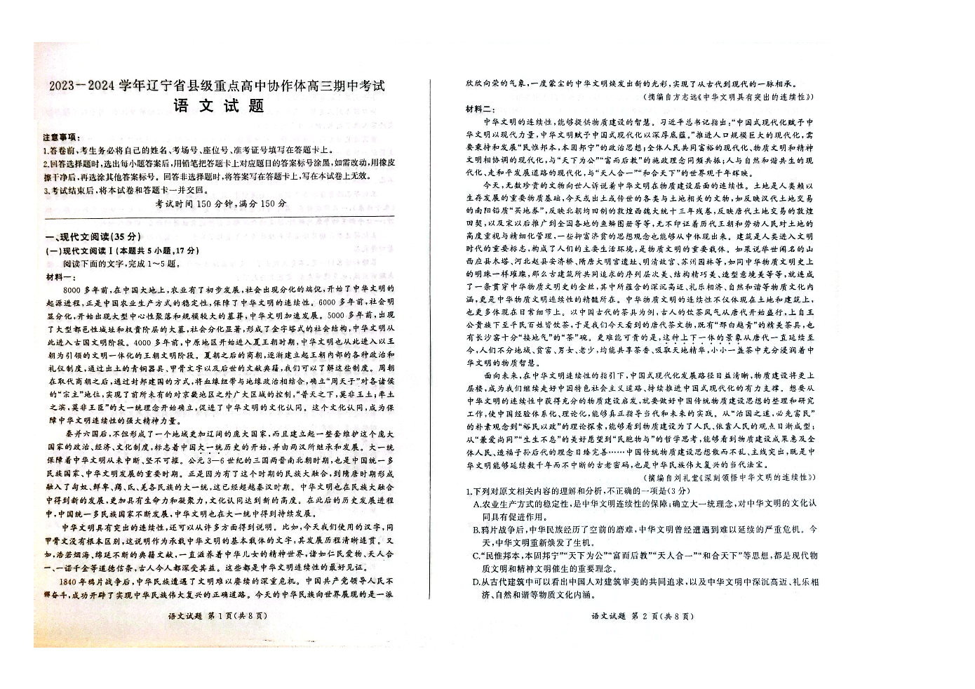 辽宁省县级重点高中协作体2023-2024学年高三上学期期中考试 语文