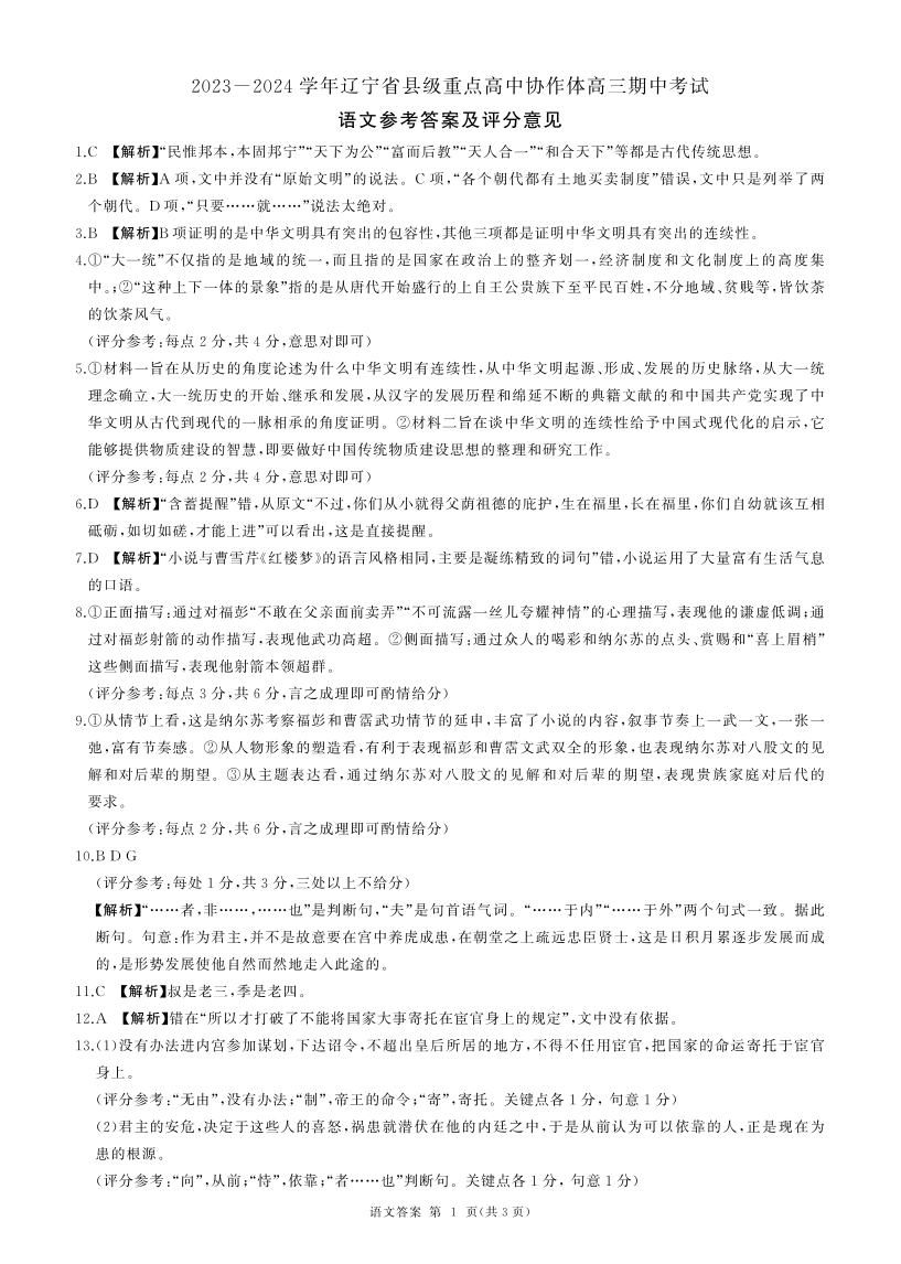 辽宁省县级重点高中协作体2023-2024学年高三上学期期中考试 语文答案