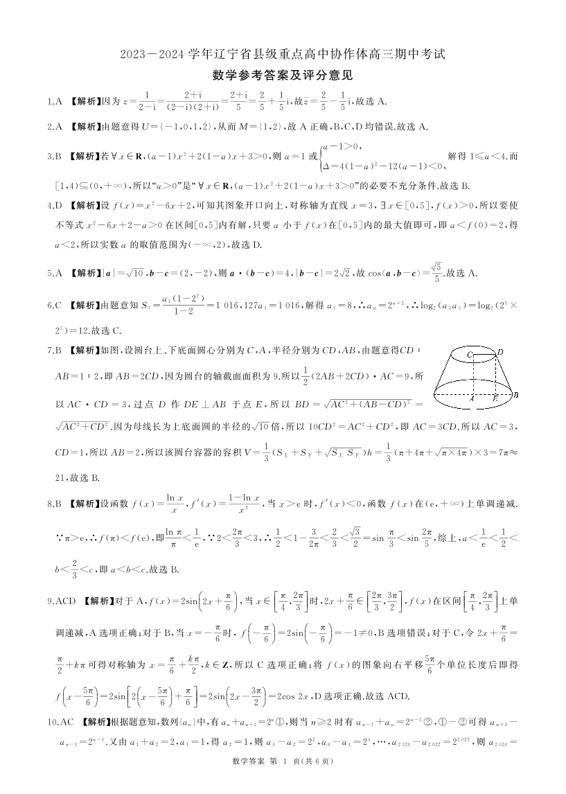 辽宁省县级重点高中协作体2023-2024学年高三上学期期中考试 数学答案