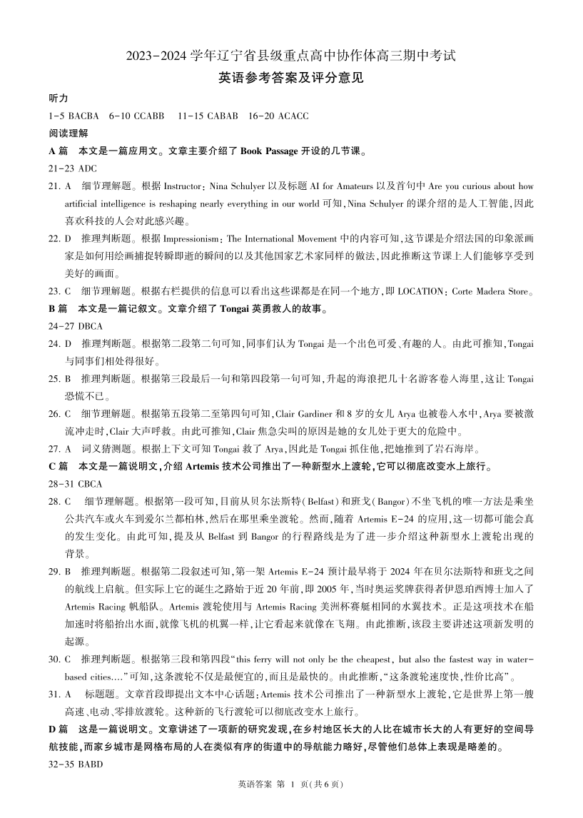 辽宁省县级重点高中协作体2023-2024学年高三上学期期中考试 英语答案