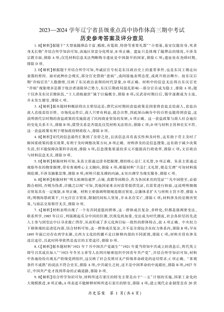 辽宁省县级重点高中协作体2023-2024学年高三上学期期中考试 历史答案