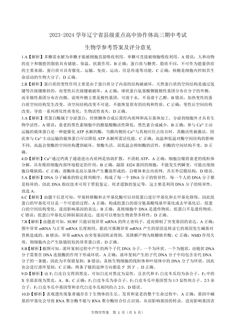 辽宁省县级重点高中协作体2023-2024学年高三上学期期中考试 生物答案