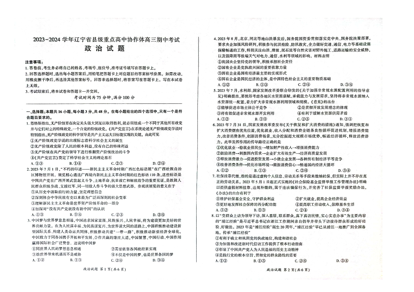 辽宁省县级重点高中协作体2023-2024学年高三上学期期中考试 政治