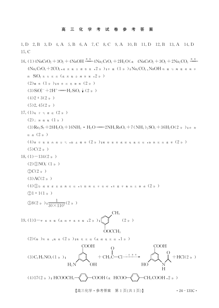 辽宁省朝阳地区2023-2024学年高三上学期期中考试 化学答案