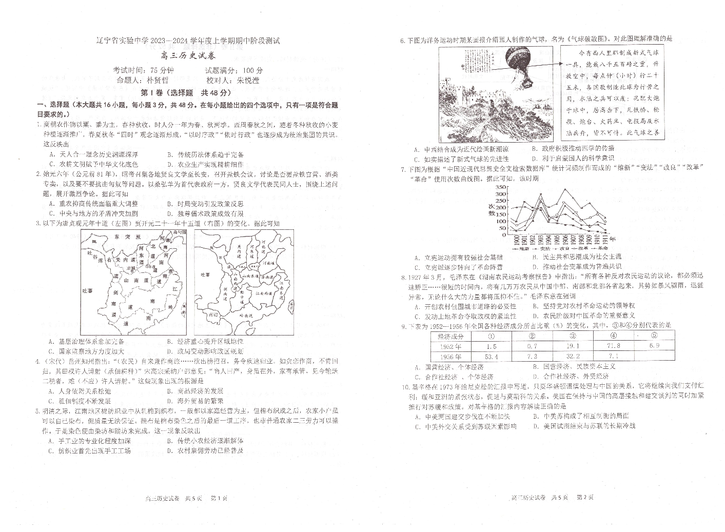 辽宁省实验中学2023-2024学年高三上学期期中考试 历史