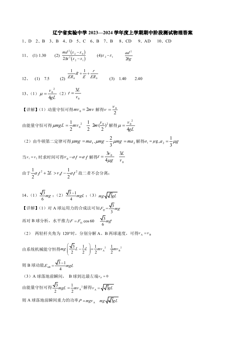 辽宁省实验中学2023-2024学年高三上学期期中考试 物理答案
