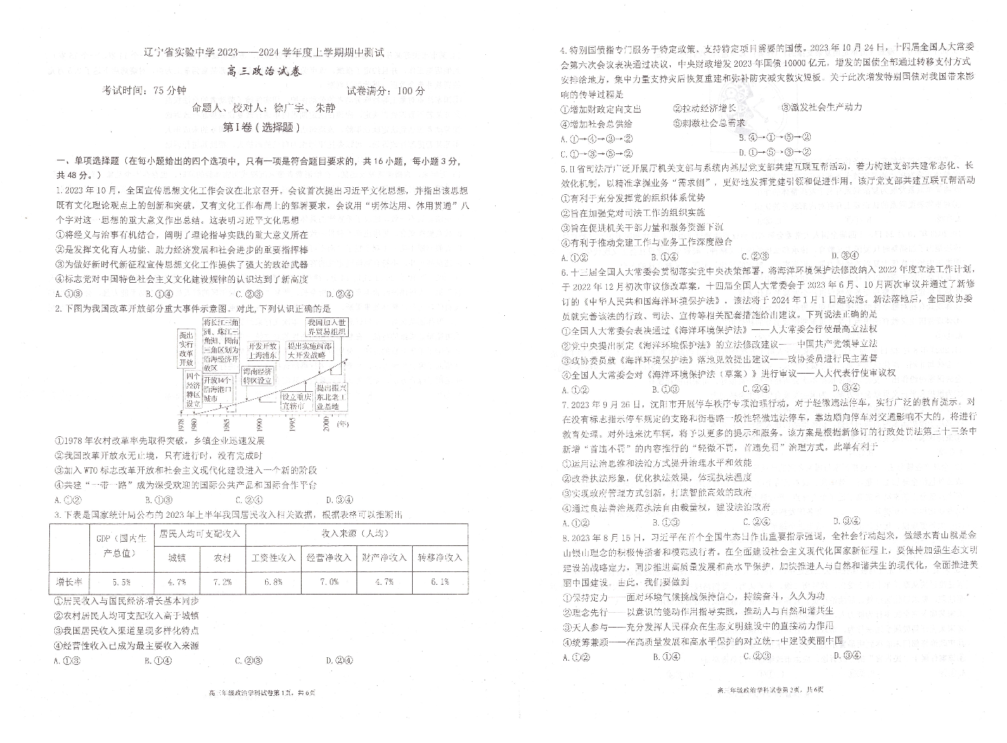辽宁省实验中学2023-2024学年高三上学期期中考试 政治