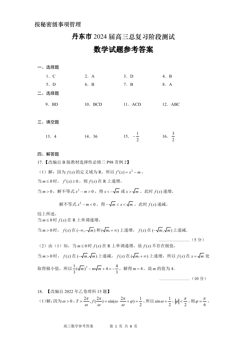 辽宁省丹东市2023-2024学年高三上学期11月阶段测试 数学答案