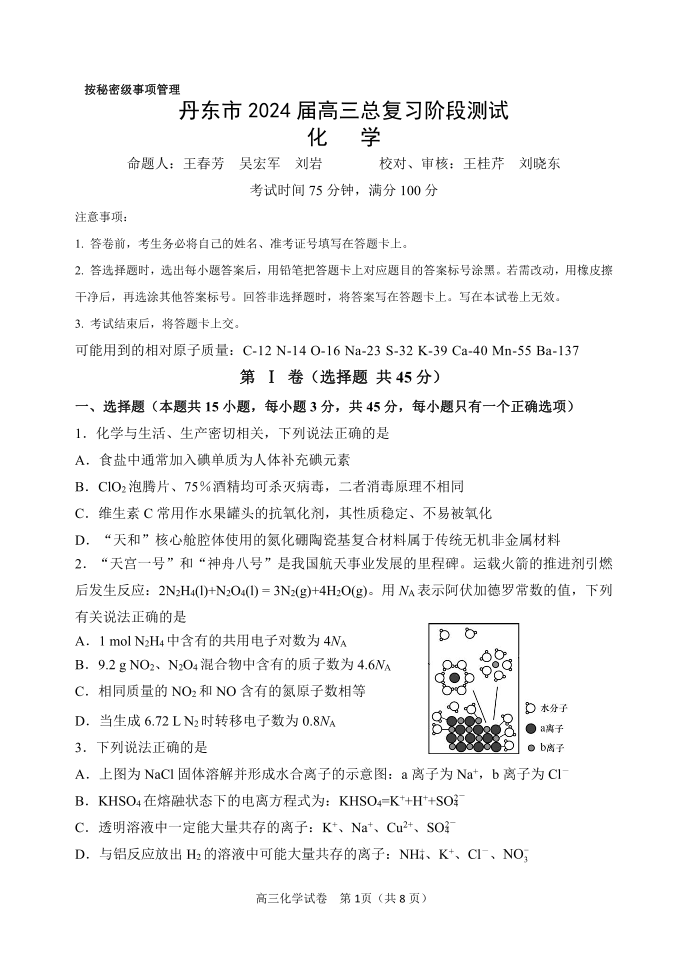 辽宁省丹东市2023-2024学年高三上学期11月阶段测试 化学