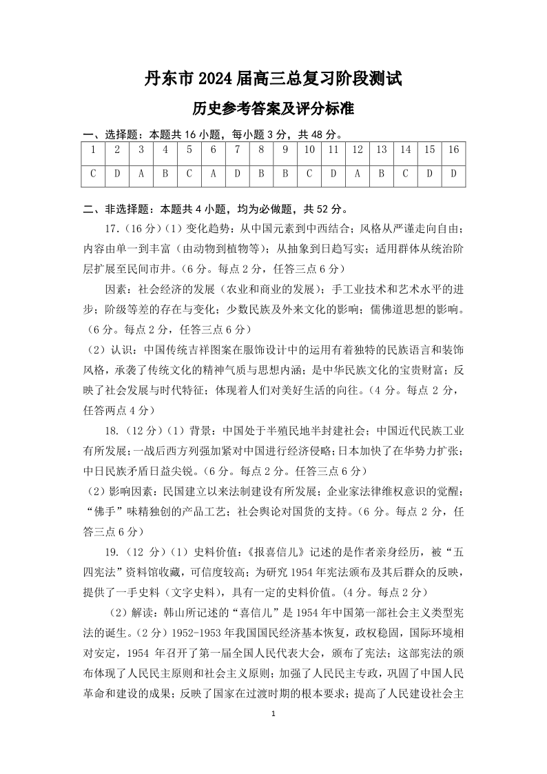 辽宁省丹东市2023-2024学年高三上学期11月阶段测试 历史答案