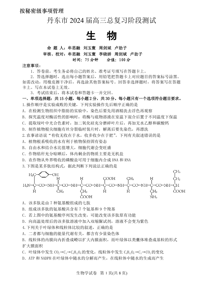 辽宁省丹东市2023-2024学年高三上学期11月阶段测试 生物