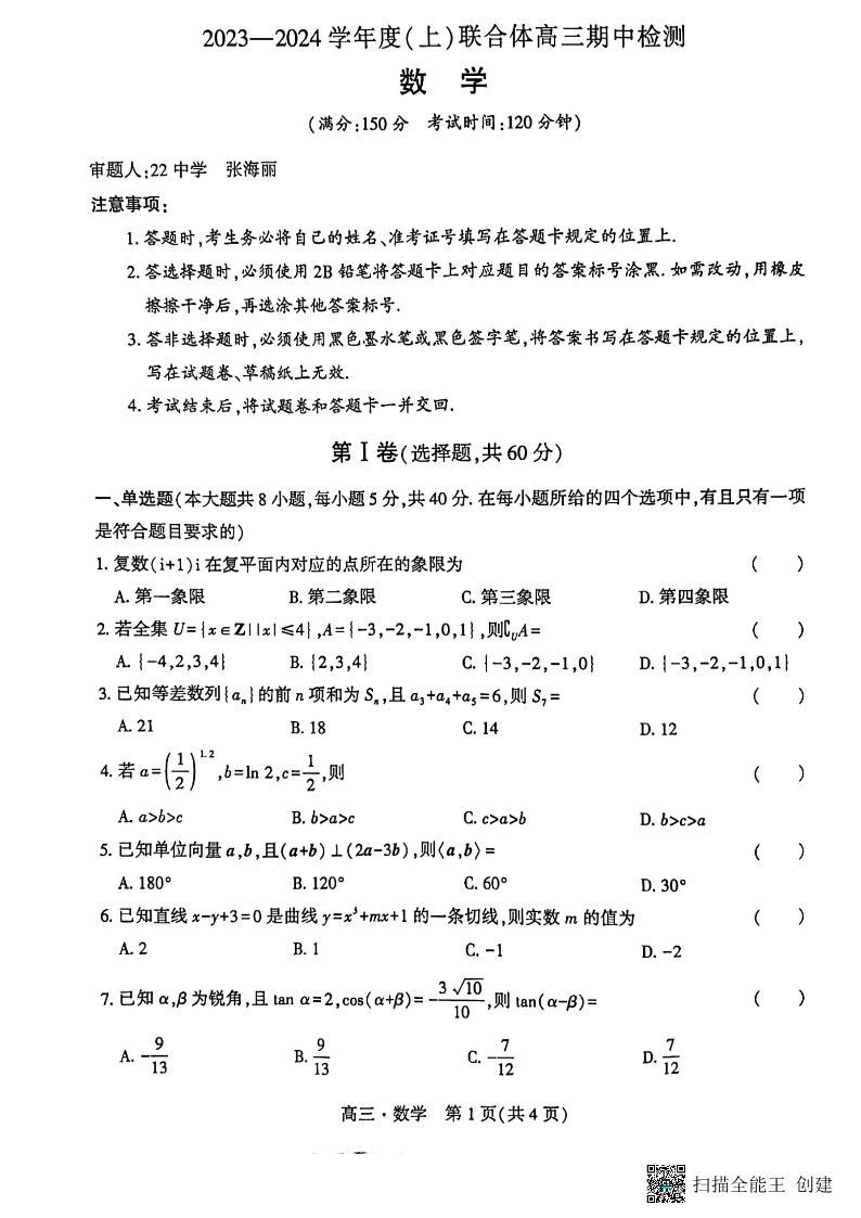 辽宁省沈阳市重点高中联合体2023-2024学年高三上学期期中考试 数学