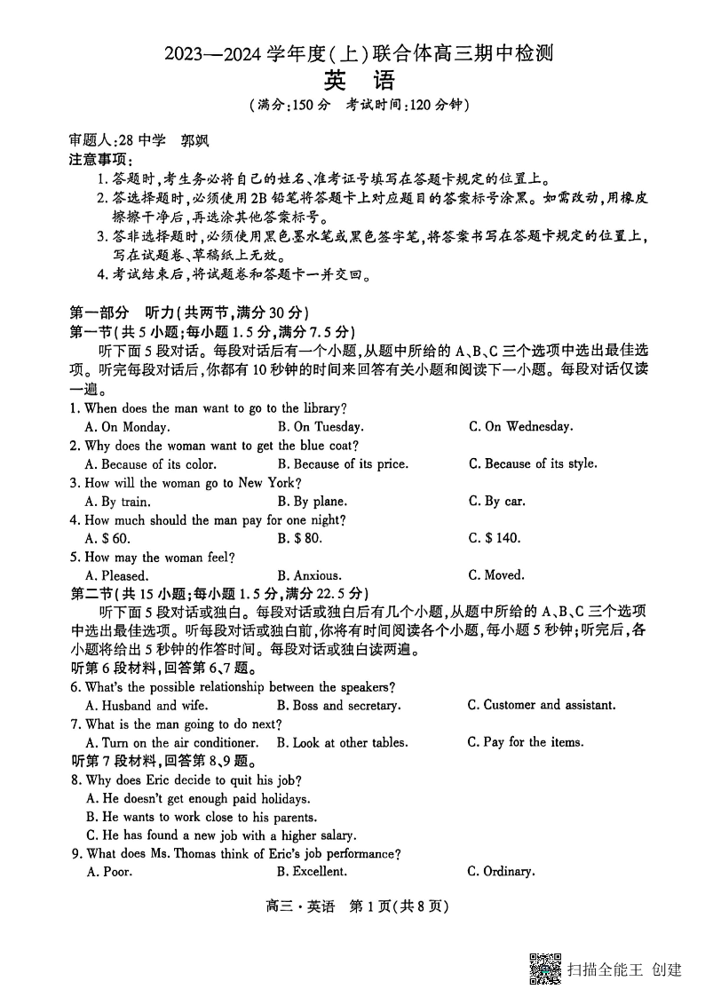 辽宁省沈阳市重点高中联合体2023-2024学年高三上学期期中考试 英语