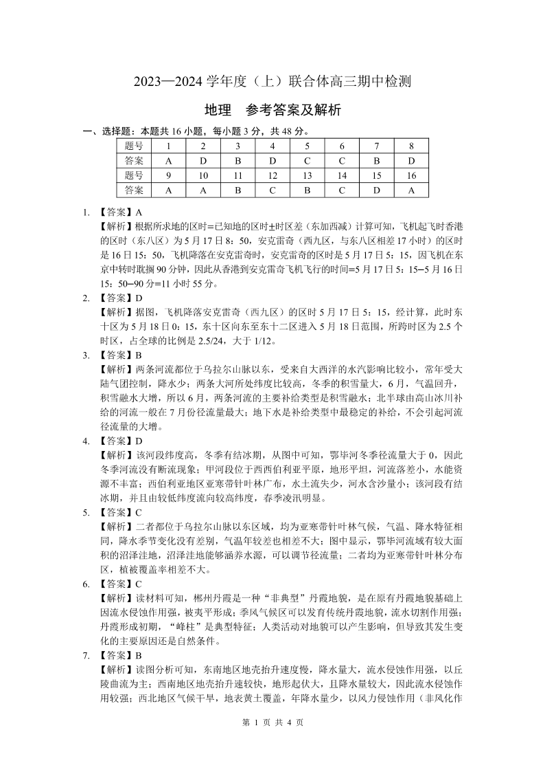 辽宁省沈阳市重点高中联合体2023-2024学年高三上学期期中考试 地理答案