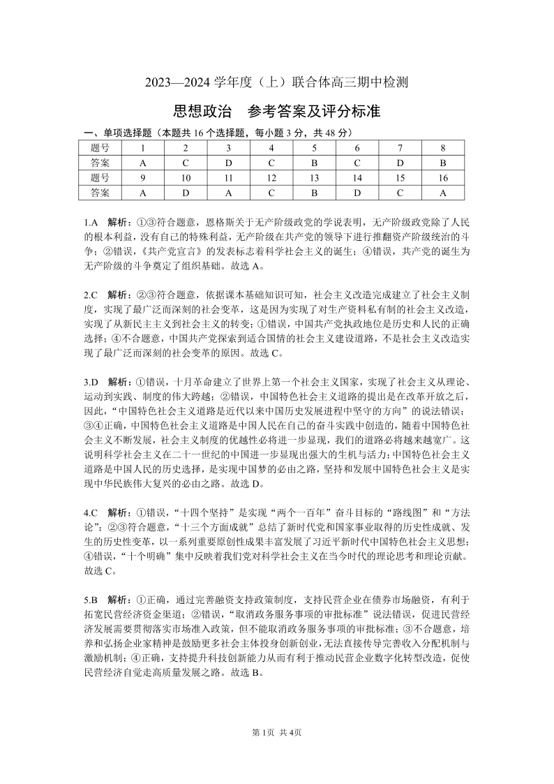 辽宁省沈阳市重点高中联合体2023-2024学年高三上学期期中考试 政治答案