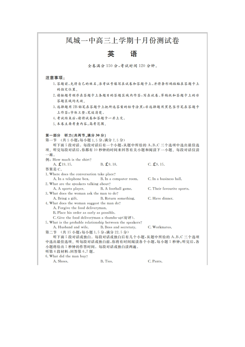 辽宁省凤城市第一中学高三上学期10月测试 英语