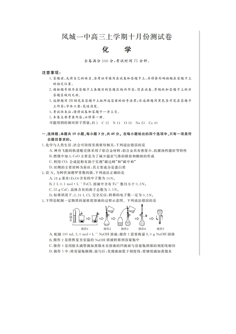 辽宁省凤城市第一中学高三上学期10月测试 化学