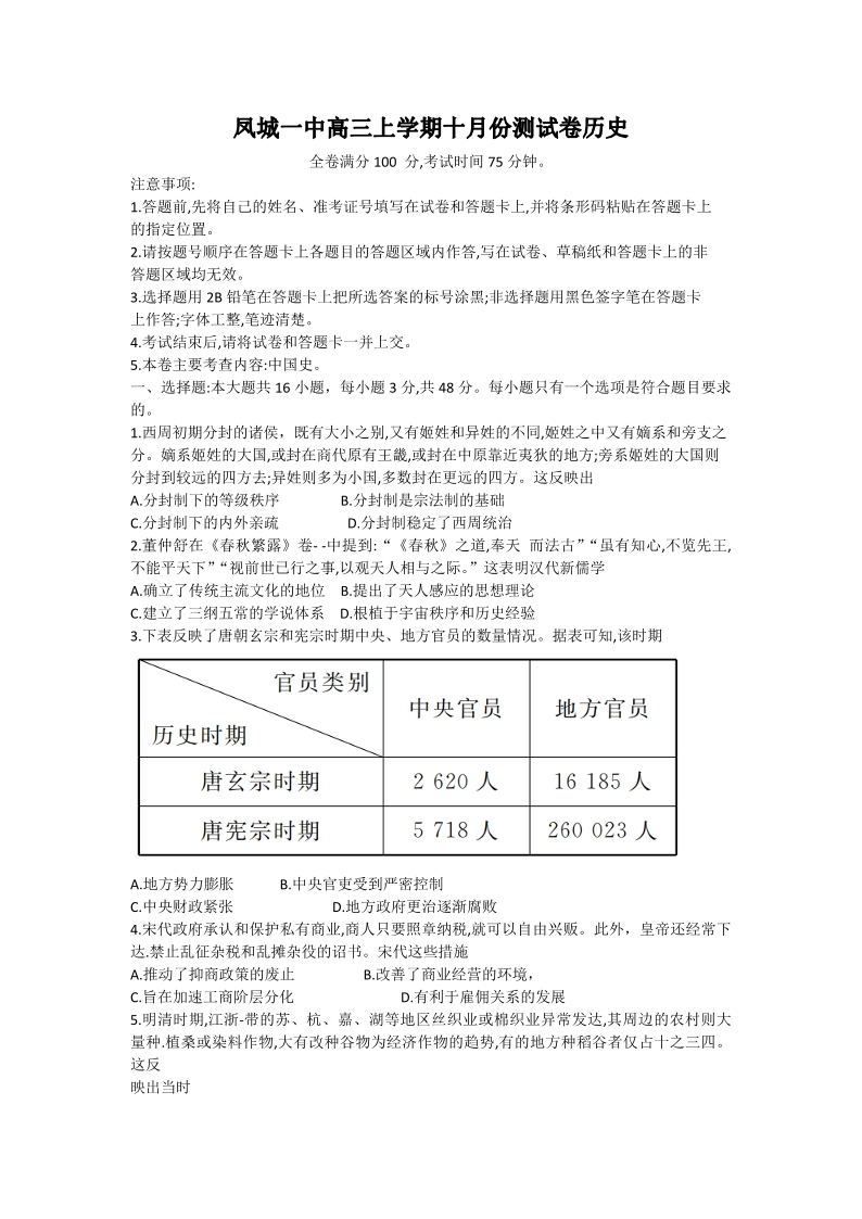 辽宁省凤城市第一中学高三上学期10月测试 历史