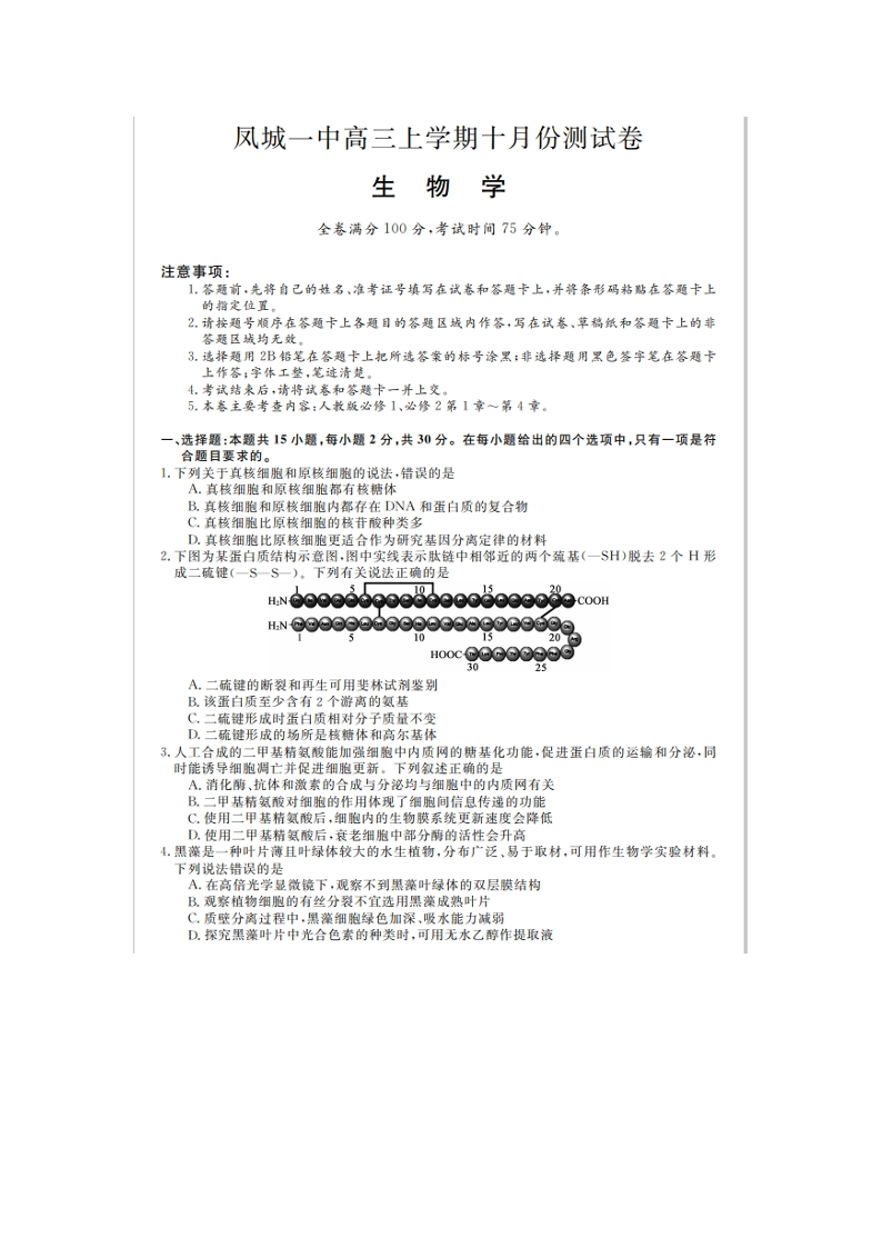 辽宁省凤城市第一中学高三上学期10月测试 生物