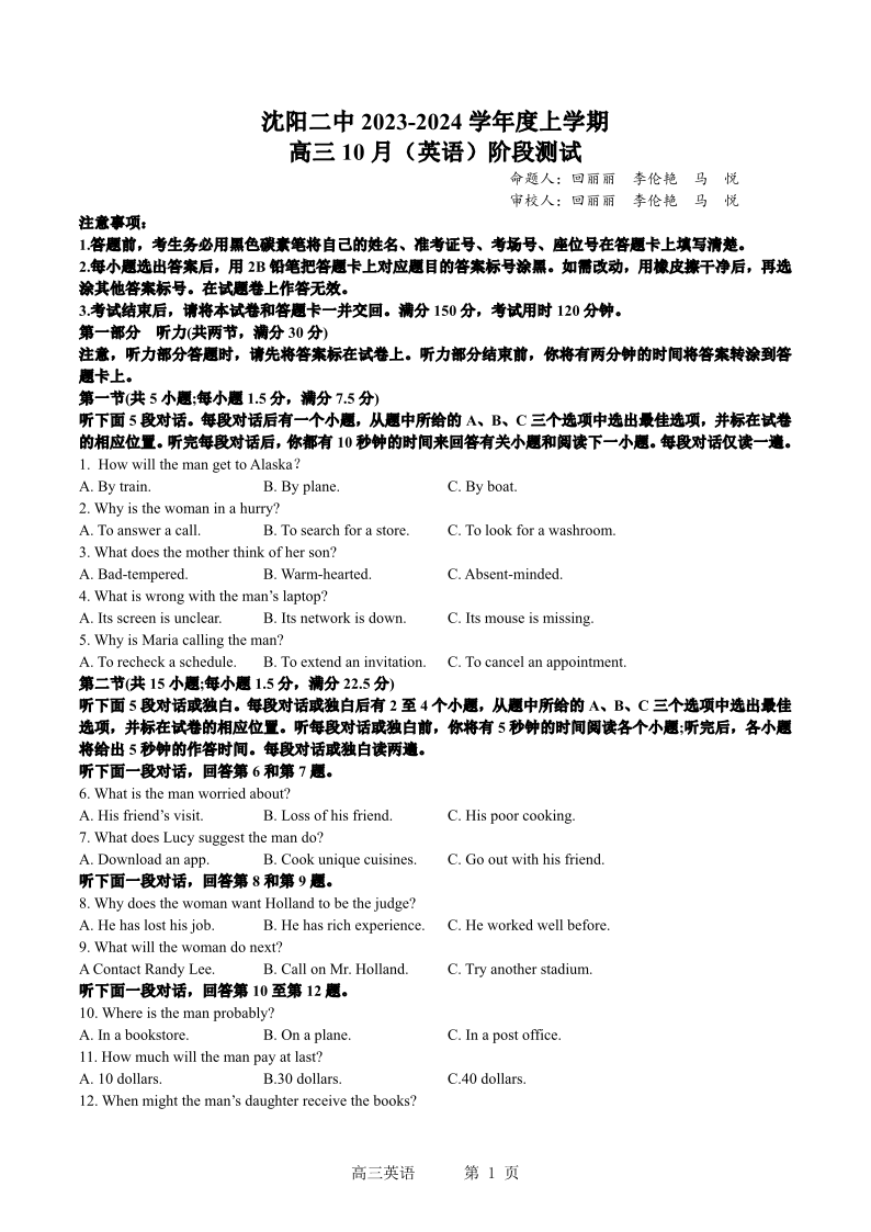 辽宁省沈阳市第二中学2023-2024学年高三上学期10月阶段测试 英语